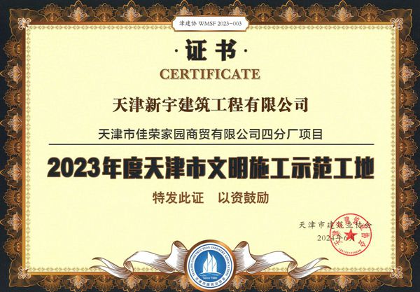 天津佳荣家园商贸有限公司四分厂项目荣获2023年度市文明施工示范工地