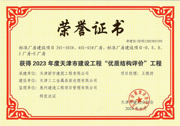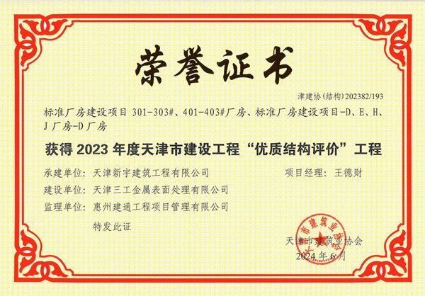 标准厂房建设项目301-303#、401-403#厂房、标准厂房建设项目—D、E、H、J厂房—D厂房获得2023年度市建设米兰网站_米兰(中国)官方“优质结构评价”米兰网站_米兰(中国)官方称号