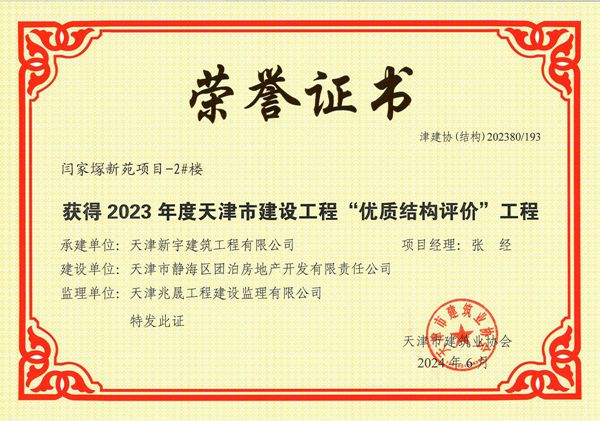 闫家塚新茆项目—2#楼获得2023年度市建设米兰网站_米兰(中国)官方“优质结构评价”米兰网站_米兰(中国)官方称号