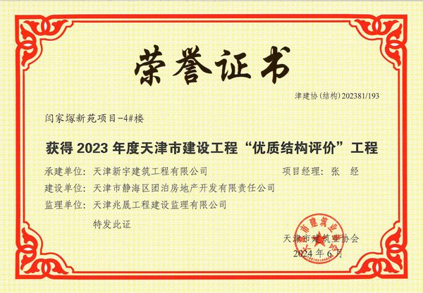 闫家塚新茆项目—4#楼获得2023年度市建设米兰网站_米兰(中国)官方“优质结构评价”米兰网站_米兰(中国)官方称号