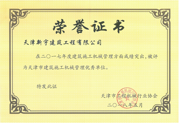 被评为2017年度天津市建筑施工机械管理优秀单位