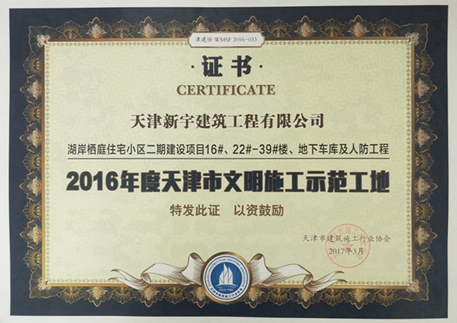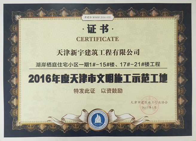 湖岸栖庭住宅小区二期16#、22-39#等获2016年度天津市文明施工示范工地